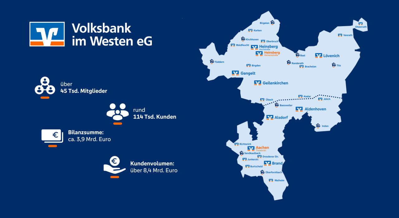 Mit einem einstimmigen Votum in Aachen bzw. einem deutlichen Votum von 97,9 % in Heinsberg haben die Vertreterinnen und Vertreter der Aachener Bank eG sowie der Volksbank Heinsberg eG in ihren Vertreterversammlungen am 25. und 26. November die Fusion der beiden Bankhäuser beschlossen. Damit ist der Weg für die beiden bislang erfolgreichen Volksbanken zu einem zukunftsorientierten und leistungsstarken Kreditinstitut frei, das unter dem Dachnamen Volksbank im Westen eG firmieren wird. Die regional vertrauten Marken „Aachener Bank“ und „Volksbank Heinsberg“ bleiben in den jeweiligen Geschäftsgebieten erhalten.